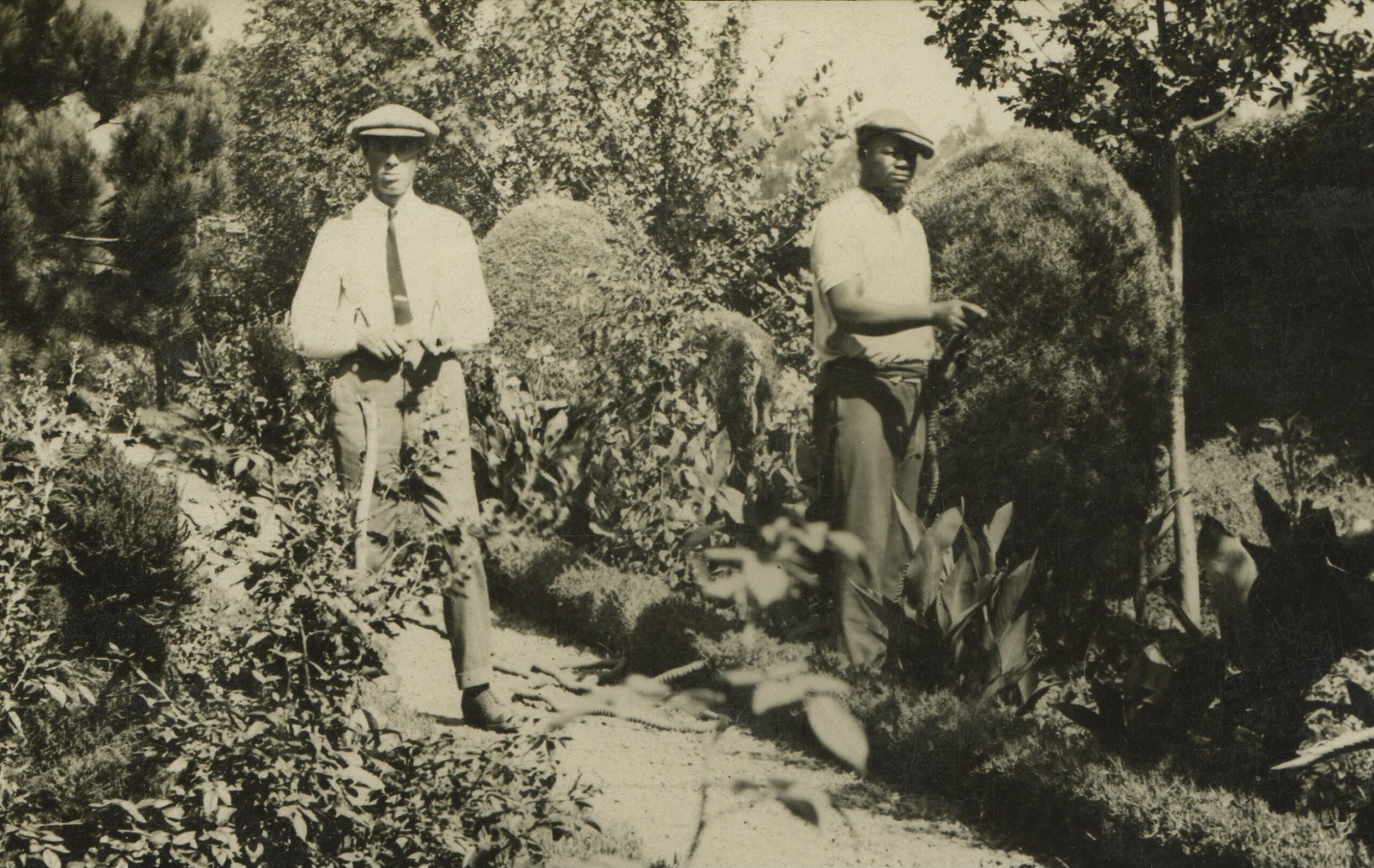 A photographic postcard of a black gardener watering a box-edged flower bed of cannas and roses with a colleague adjacent. Location is unknown, but published by KT Ltd, and probably c.1930. Garden Museum collection