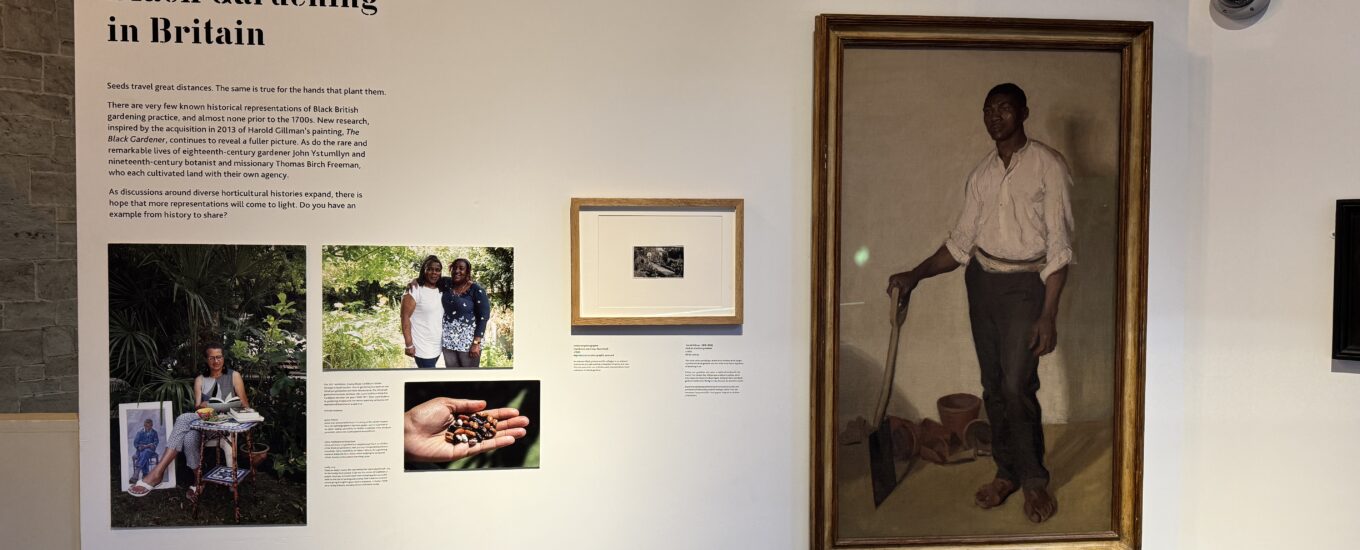Being given the opportunity to put together a display that centres around Black gardeners and their practices was not without its challenges. There are (currently) few known artistic representations of Black British gardening practice historically. Showcasing works of people who are gardening of their own agency, as opposed to being an ornament in a painting was my aim. There are several examples of people of African descent being utilised as props in gardening. John Nost’s Blackamoors are a fine example of this, where the statues are depicted as kneeling in quite uncomfortable positions. With this being my first time curating a display, I have learned so much. Learning about the different panel length requirements, observing the conversations around printing labels and finding the right angle for placing works. I went back and forth with Ella Finney, Assistant Curator, on the different ways in which the artworks could hang. I am so grateful to Ella for her patience, skill and flexibility.  These are details that I will appreciate even more when I walk around galleries and museums, and it has been affirming to see the response to the display from visitors. I wanted the rehang to prompt people to question. It highlights those who brought contributions to horticulture, contributions that may have previously been diminished or criticised. The display serves as a celebration of Black British gardeners in their entirety. Whilst the original brief had been around historic Britain, I felt it necessary to have the inclusion of contemporary gardeners, who through their various cultural bricolages, constantly provide new plots for us to learn from. The display features John Ystumllyn, a Black Welsh gardener who lived and worked in North Wales in the 1700s whose illuminating life still leaves so much to be discovered. He is joined by the Gilman painting of the Black gardener, whose presence kickstarted this line of questioning. There is not much known about the subject in the painting; I wondered what Gilman’s intention had been in painting a figure of African heritage, especially in the height of Pax Britannica. Gilman was known as a radical, but why did he use this specific figure?  Who was the man in the painting?