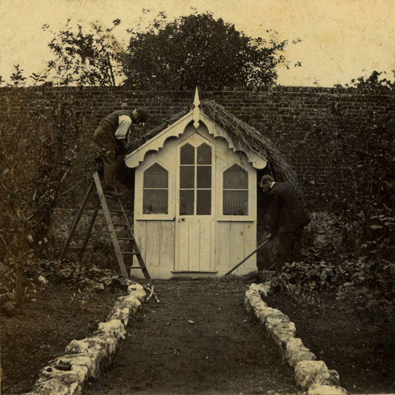 A photograph from a stereocard showing two men in a garden, one thatching a small, ornate summerhouse. Undated, but probably c.1900.