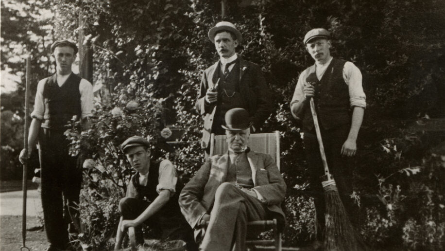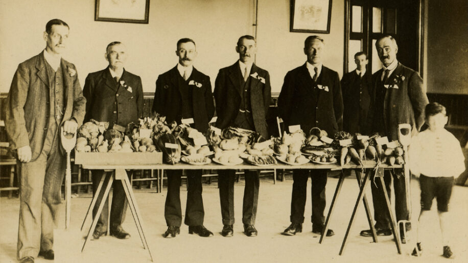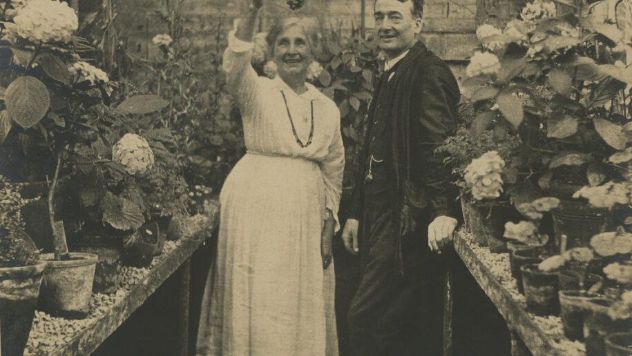 A photographic postcard of a large group of women and men posing before a large greenhouse – employees of the nursery or market garden, probably tomatoes behind. Stamped ‘W. Webb’ on reverse. Postally unused and undated, but perhaps c.1910.