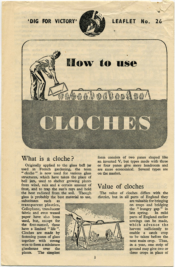 Dig for Victory No. 26: How to use Cloches. This leaflet was issued during World War II by the Ministry of Agriculture, Government Buildings, Lytham St Anne’s, Lancashire, as part of the drive to encourage the public produce more food in their gardens and on vacant land.