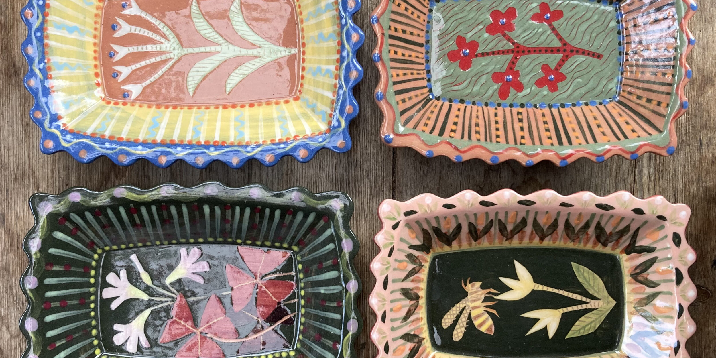 Kate's work combines traditional ceramic forms with uplifting decoration. A rural upbringing in the heart of the Kentish countryside, alongside her background in illustration and a love of historic folk art, have inspired longstanding themes of antique florals, animals and the natural world. Working in hand thrown or slab moulded earthenware and stoneware, she employs a decorative technique involving the layering of fine brushwork with sgraffito and wax resist in order to create depth and character. Colour is of great importance in Kate's work, with warm earthy tones featuring heavily to mimic nature’s pallet.