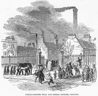 In 1703 Archbishop Tenison bought a garden on the site for £120 and donated it to the parish of St Mary’s. Lambeth was green and bright then, and a windmill turned on the High Street. But the churchyard of St Mary’s was clogged with coffins of the poor (the rich were buried inside; Tenison himself was one of the Archbishops discovered under the chancel in 2017). Tenison’s gift was to extend the churchyard. In 1814 the Parish paid £3,178 to buy more land (and £15 and five shillings on a feast to celebrate the extension). In the next few decades factories were built on the banks of the Thames, and the village became an industrial slum, blackened by smoke from the pottery chimneys. In the cholera epidemic of 1848 over a thousand parishioners died. The churchyard was full, and in 1853 closed. An old engraving captures a funeral of the time.