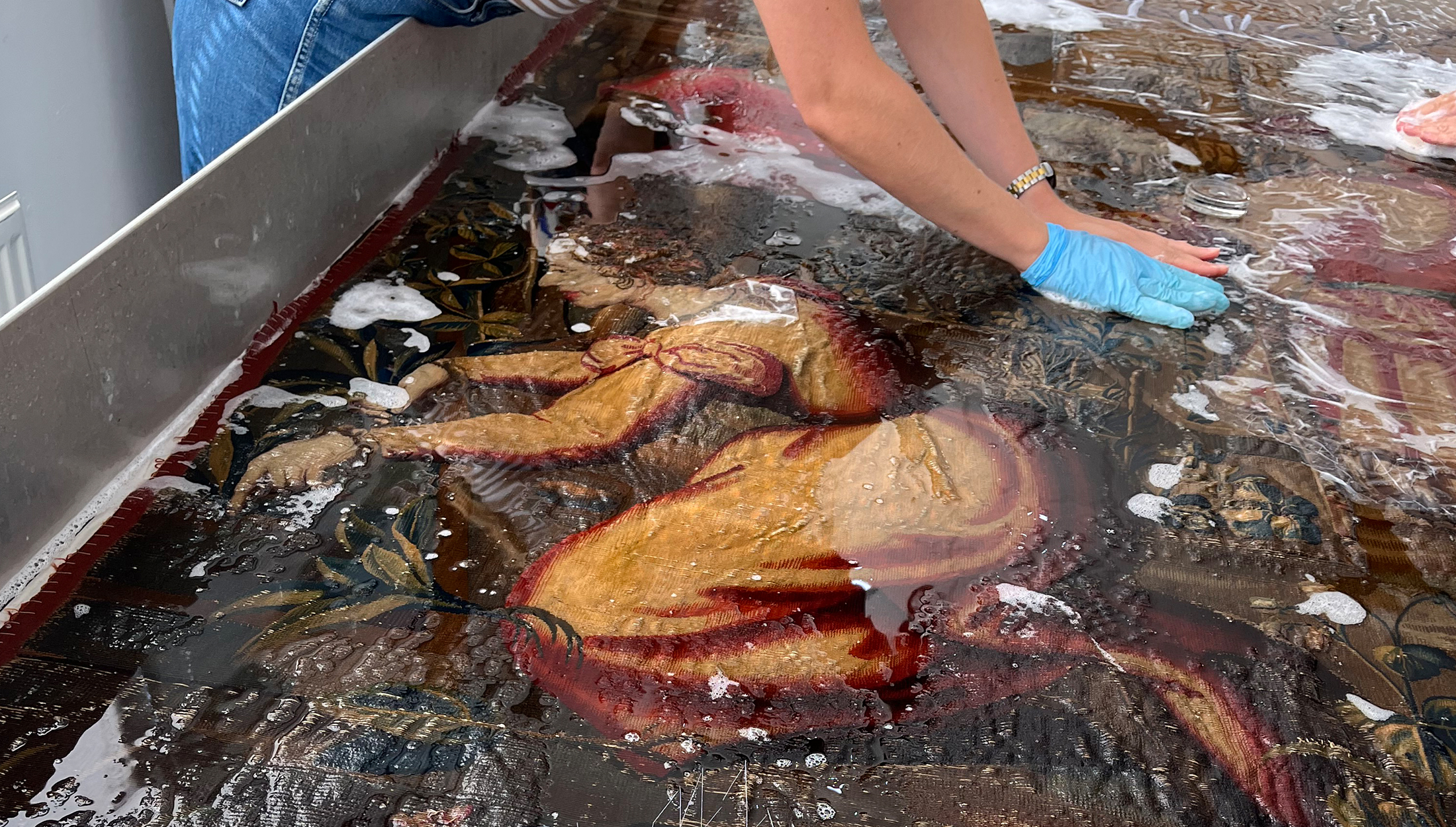 The tapestry was laid out in a large, flat wash bath, initially face up to soak in water. Delicate areas of the tapestry had netting stitched over them to protect them during washing. Water was added with a very diluted detergent and then sponges were used to gently work over the surface of the tapestry. The water was drained and sampled to see how much cleaner the tapestry was becoming. The level of detergent in the water was decreased in subsequent washes.