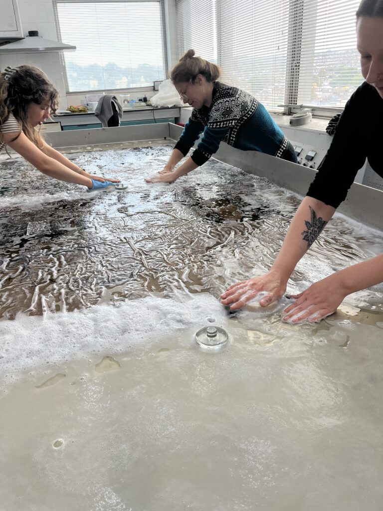 The tapestry was laid out in a large, flat wash bath, initially face up to soak in water. Delicate areas of the tapestry had netting stitched over them to protect them during washing. Water was added with a very diluted detergent and then sponges were used to gently work over the surface of the tapestry. The water was drained and sampled to see how much cleaner the tapestry was becoming. The level of detergent in the water was decreased in subsequent washes.