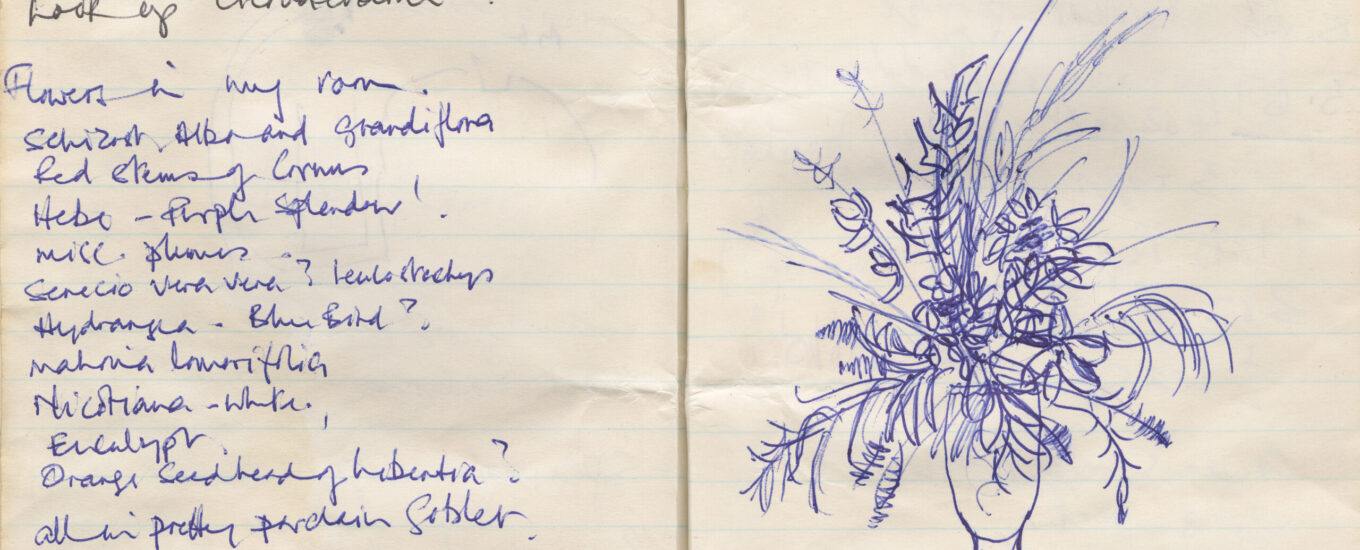 A page from the notebook Beth took to Ireland in 1991, showing a sketch of a stream bed in the Burren which inspired the design of the Gravel Garden. This image was made on a trip to Ireland in 1991 in the stony karst landscape of the Burren. It shows the beginning of the form that the gravel garden eventually took and is one of the only sketches of its development, as Beth famously used hoses laid on the ground to create her planting outlines rather than drawing plans for them. The sketch also shows the importance of these seemingly ‘throwaway’ rough notebooks. When discussing her inspiration for the gravel garden in later years Beth would focus on a dry river bed she had seen on a trip to New Zealand with Christopher Lloyd in 1989, but although this far-flung origin makes an excellent story, there’s no evidence from her notebooks that it struck her as interesting at the time, and certainly no sketches. It seems that the plan only properly takes shape two years later, on the trip to Ireland, as can be seen here. We don’t know exactly where Beth was standing to see this, who was with her, or what day it was, but this quickly scribbled impression still gives a sense of the idea forming in her mind, important enough to be jotted down for future reference. Lucky for us that she had a notebook to hand.