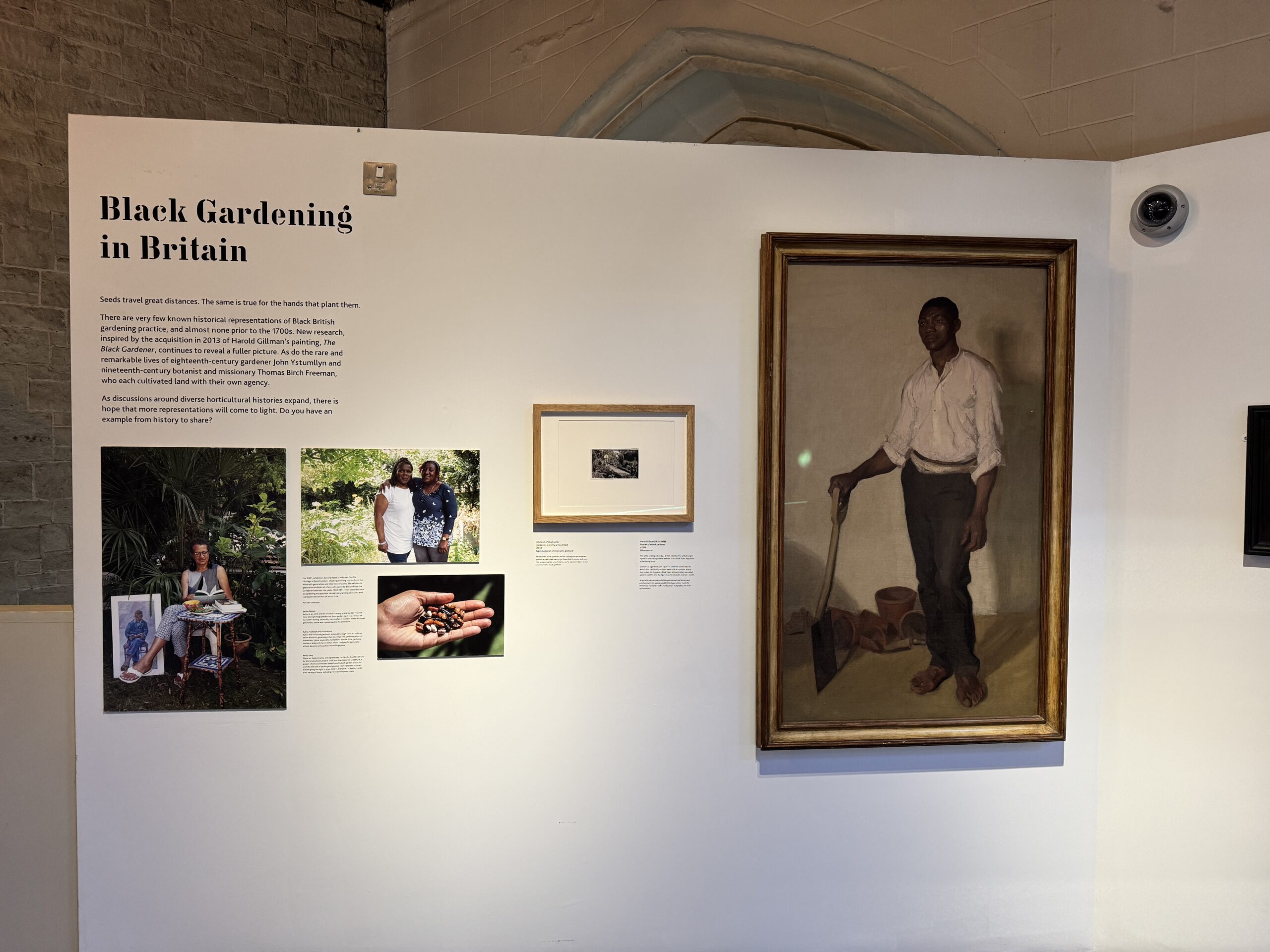 Being given the opportunity to put together a display that centres around Black gardeners and their practices was not without its challenges. There are (currently) few known artistic representations of Black British gardening practice historically. Showcasing works of people who are gardening of their own agency, as opposed to being an ornament in a painting was my aim. There are several examples of people of African descent being utilised as props in gardening. John Nost’s Blackamoors are a fine example of this, where the statues are depicted as kneeling in quite uncomfortable positions. With this being my first time curating a display, I have learned so much. Learning about the different panel length requirements, observing the conversations around printing labels and finding the right angle for placing works. I went back and forth with Ella Finney, Assistant Curator, on the different ways in which the artworks could hang. I am so grateful to Ella for her patience, skill and flexibility.  These are details that I will appreciate even more when I walk around galleries and museums, and it has been affirming to see the response to the display from visitors. I wanted the rehang to prompt people to question. It highlights those who brought contributions to horticulture, contributions that may have previously been diminished or criticised. The display serves as a celebration of Black British gardeners in their entirety. Whilst the original brief had been around historic Britain, I felt it necessary to have the inclusion of contemporary gardeners, who through their various cultural bricolages, constantly provide new plots for us to learn from. The display features John Ystumllyn, a Black Welsh gardener who lived and worked in North Wales in the 1700s whose illuminating life still leaves so much to be discovered. He is joined by the Gilman painting of the Black gardener, whose presence kickstarted this line of questioning. There is not much known about the subject in the painting; I wondered what Gilman’s intention had been in painting a figure of African heritage, especially in the height of Pax Britannica. Gilman was known as a radical, but why did he use this specific figure?  Who was the man in the painting?