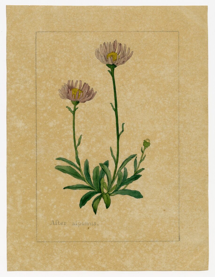 James Sowerby (1757-1822) created watercolours to illustrate his 36-volume work on the botany of England. Prior to this major project he had collaborated with botanist William Curtis – who had established a botanical garden in Lambeth-providing illustrations for his Flora Londinensis (1777) and the Botanical Magazine (first published in 1787). This illustration shows Aster Alpinus, commonly called Blue Alpine Daisy, a herbaceous perennial which is native to the Alps and Pyrenees.