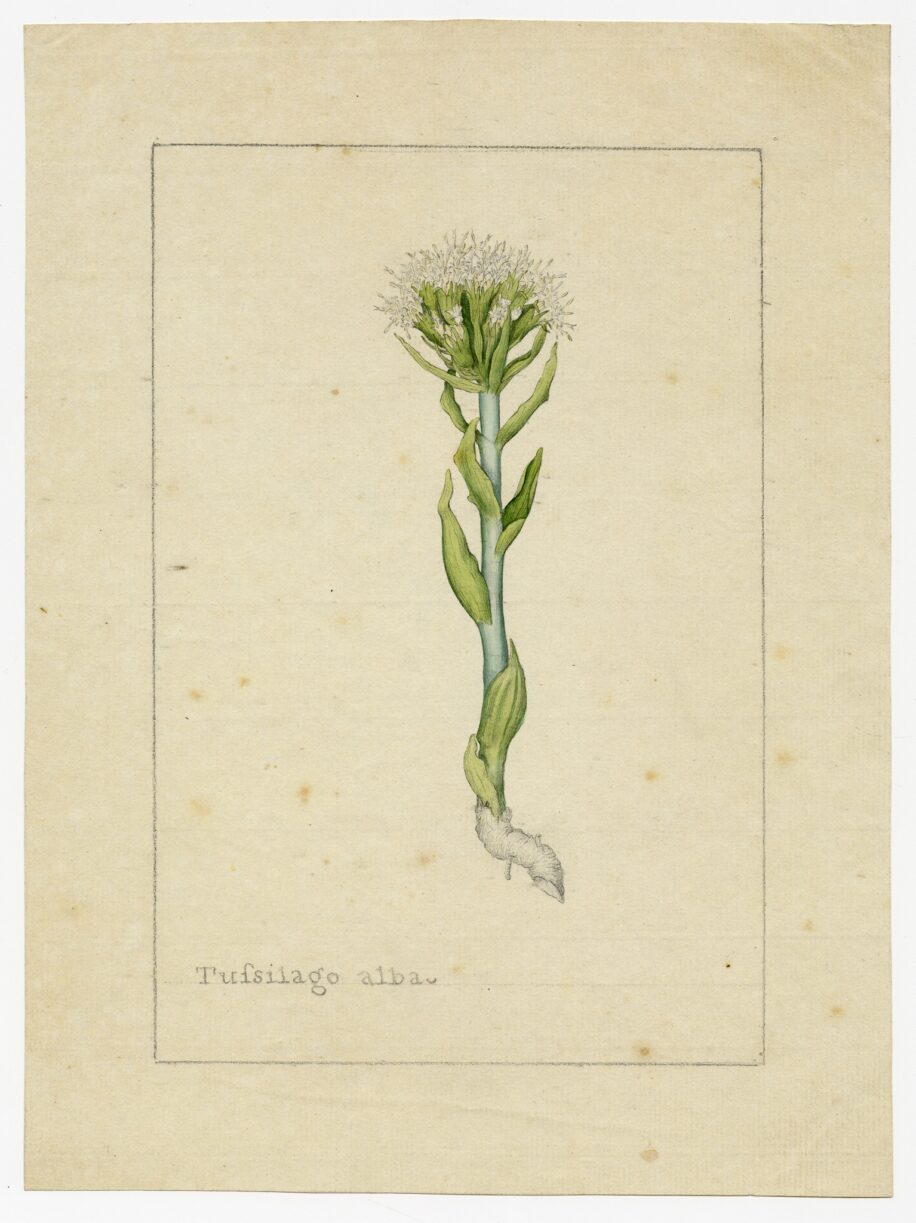 James Sowerby (1757-1822) created watercolours to illustrate his 36-volume work on the botany of England. Prior to this major project he had collaborated with botanist William Curtis – who had established a botanical garden in Lambeth – providing illustrations for his Flora Londinensis (1777) and the Botanical Magazine (first published in 1787). This illustration shows Tussilago Alba which is also known as Petasites Albus and commonly called White Butterburr. Tussilago Alba is found across the UK, but is native to northern and middle Europe as well as the temperate areas of Asia.