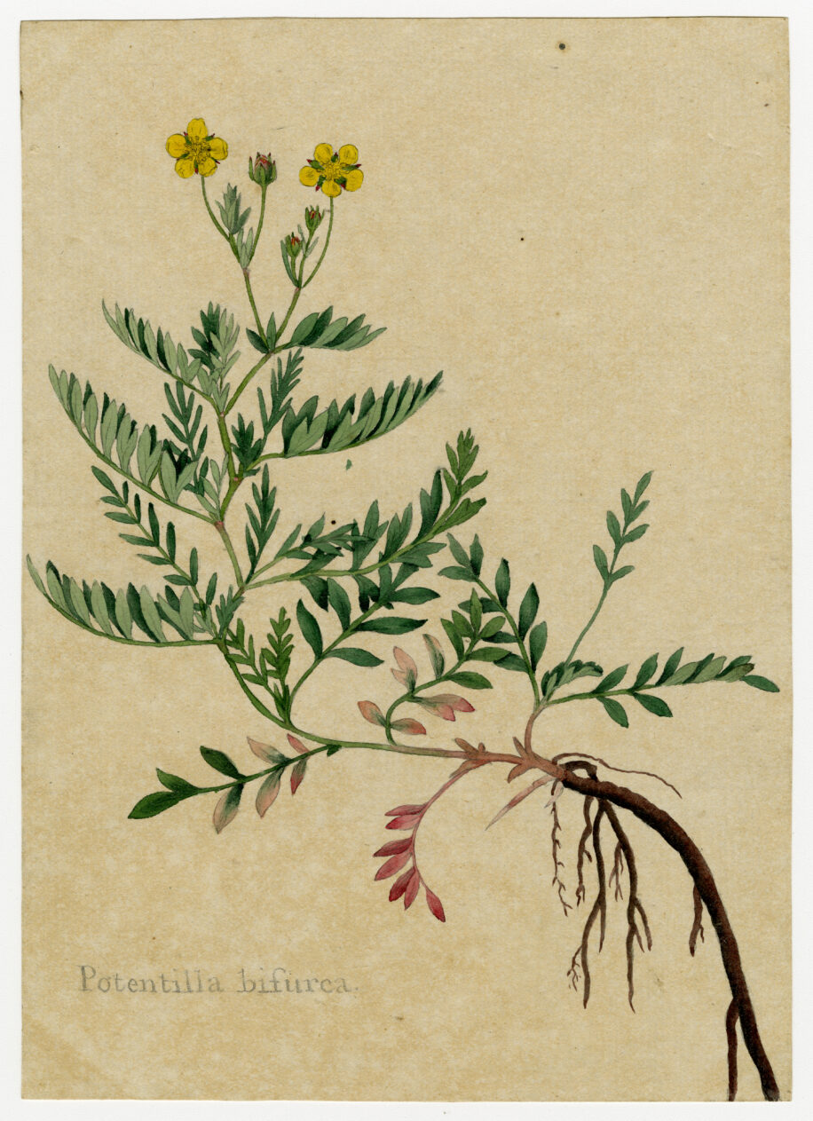 James Sowerby (1757-1822) created watercolours to illustrate his 36-volume work on the botany of England. Prior to this major project he had collaborated with botanist William Curtis – who had established a botanical garden in Lambeth-providing illustrations for his Flora Londinensis (1777) and the Botanical Magazine (first published in 1787). This illustration shows Potentilla Bifurca, also known as Schistophyllidium Bifurcum, which is native to the Russian, Korean and Mongolian slopes and grasslands as well as the north coast of China.