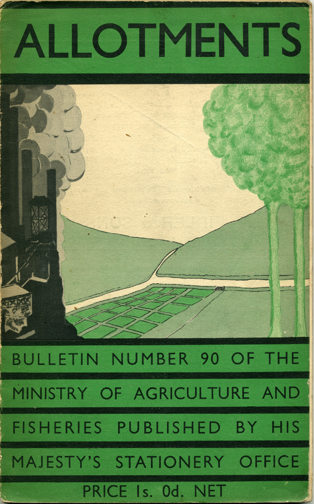A bulletin published by HMSO for the Ministry of Agriculture & Fisheries, ‘Allotments’ No.90, written by J Storey, dated November 1936. Contents include crop rotation, allotment sheds pests & diseases, exhibiting and the economic value of allotments.