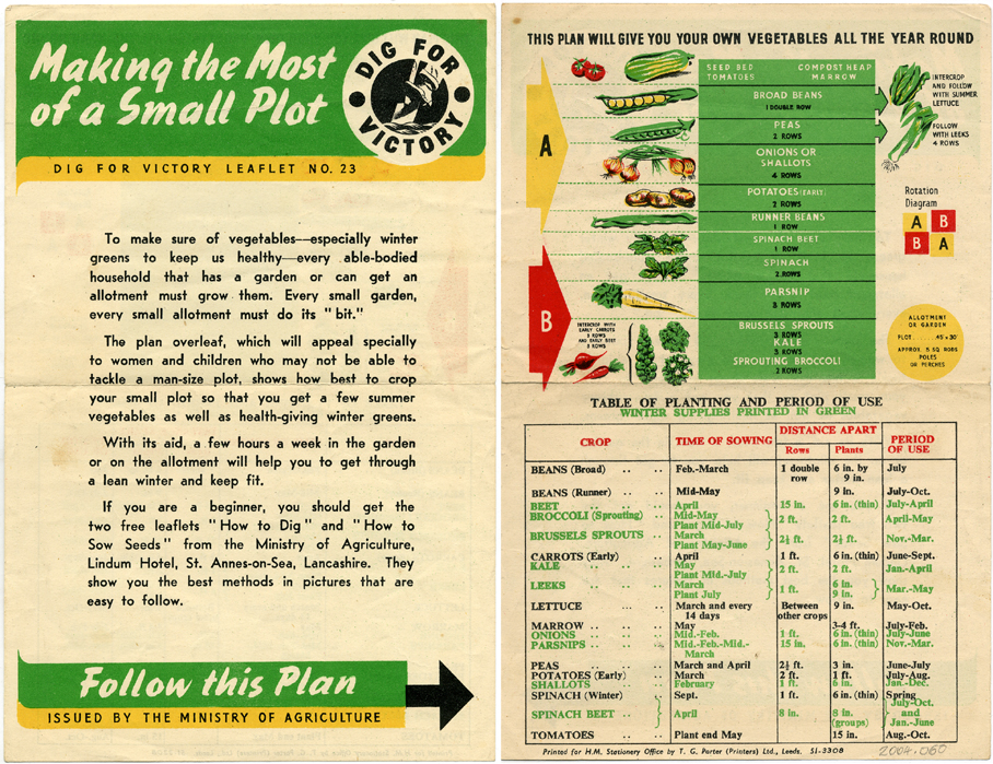 A ‘Dig For Victory’ leaflet for vegetable growing during World War II titled Making the Most of a Small Plot and with a cropping chart printed on the back. Issued by Ministry of Agriculture.