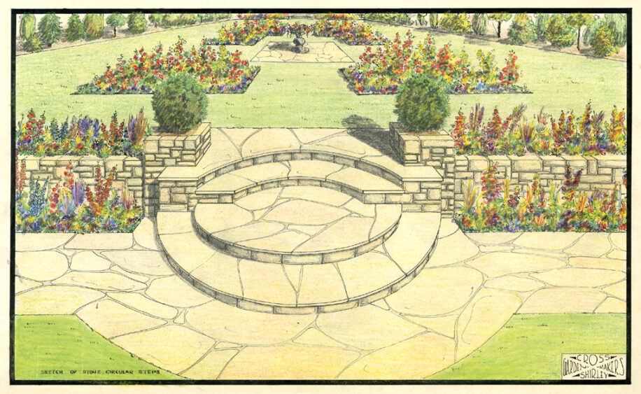 A garden design by Cross of Shirley, near Croydon in South London, featuring circular crazy-paving stone steps leading up to flower beds and bird bath. Undated, but probably c.1935.