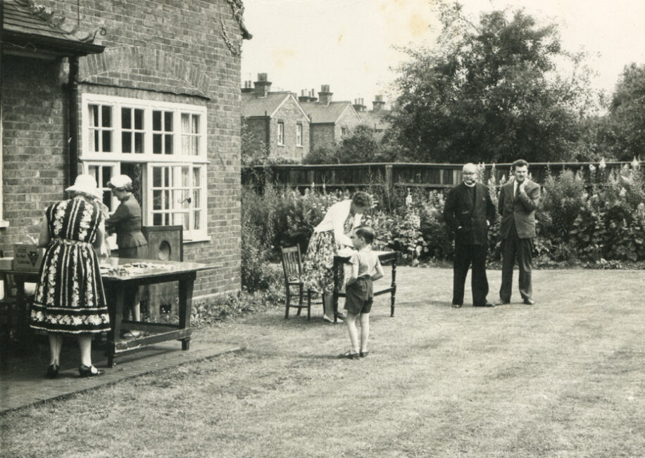 A photograph of a vicar on a lawn in the back garden of a suburban house. Annotated on the back, ‘St Barnabas, Epsom, Vicarage Fete 1961.’