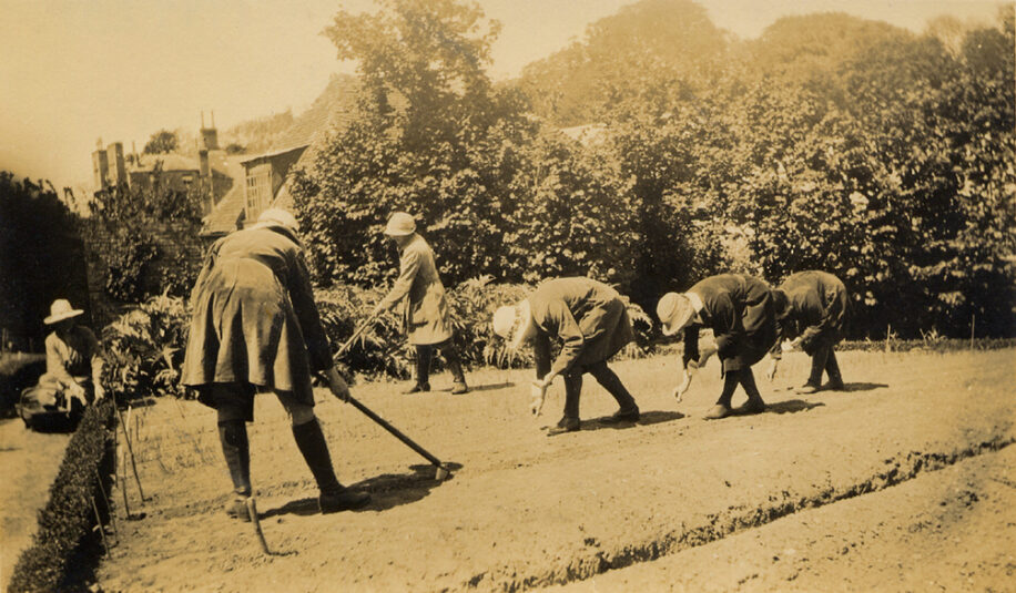 A photograph of schoolgirls planting vegetables in a school allotment – one clipping a box hedge, two hoeing, and three planting seeds, buildings behind. Undated, but probably c.1920.