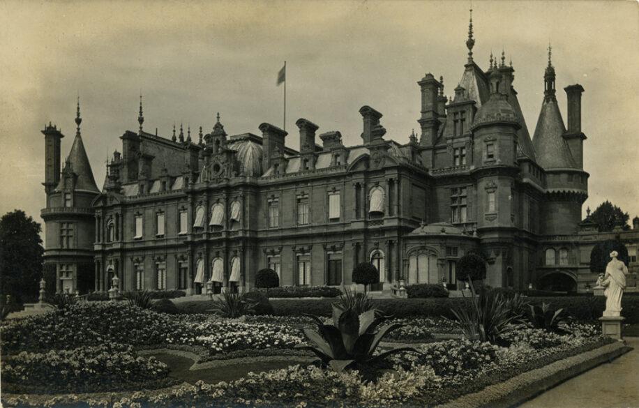 A photograph postcard of the garden front at Waddesdon Manor, Buckinghamshire, with summer bedding in the parterres featuring perlargoniums and agaves. Photographer noted as A. Cherry, Waddesdon. Postally unused, but perhaps c.1915.