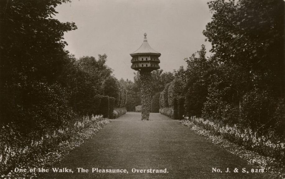 A photographic postcard of the Walks at The Pleasaunce in Overstrand, Norfolk’ showing a vista across lawns to a dovecote. Published by Jarrold’s and undated, but perhaps c.1915.