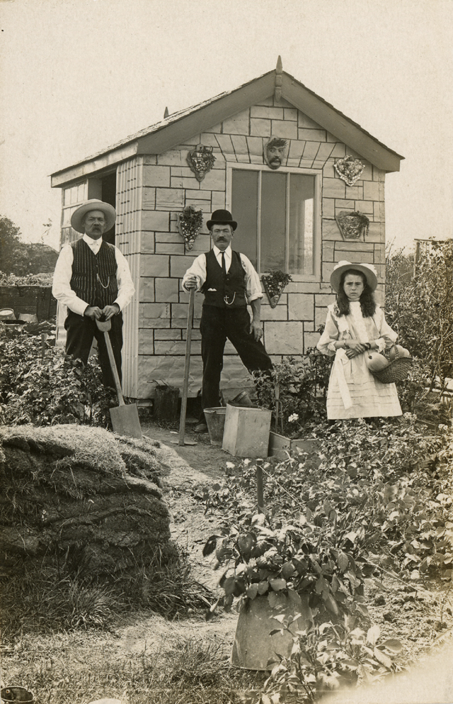 A photographic postcard of 2 men and a girl posing before a decorated garden shed, probably on an allotment. The men with tools and girl holding a trug of produce. Sent to ‘Miss Annie Snell, Surbiton, from Lottie’ and postmarked 1910, Southport.
