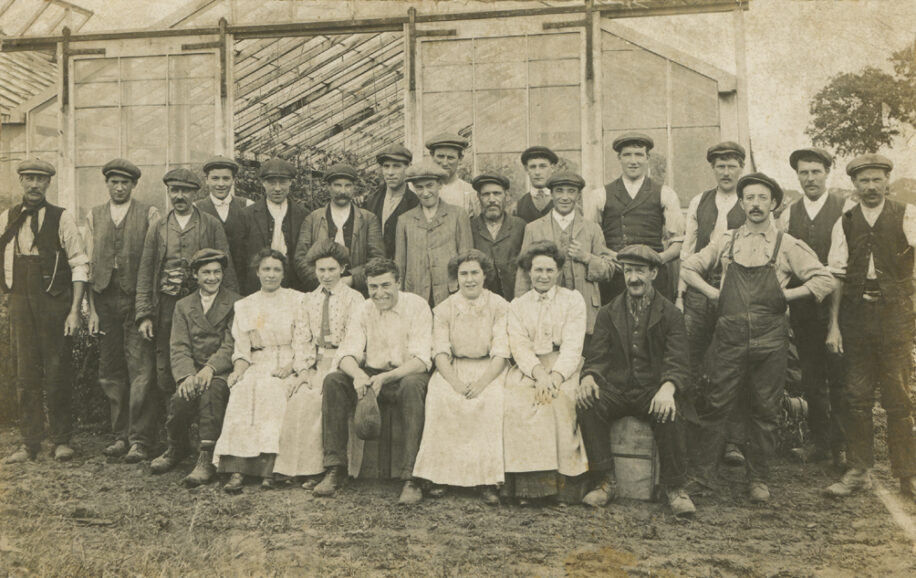 A photographic postcard of a large group of women and men posing before a large greenhouse – employees of the nursery or market garden, probably tomatoes behind. Stamped ‘W. Webb’ on reverse. Postally unused and undated, but perhaps c.1910.