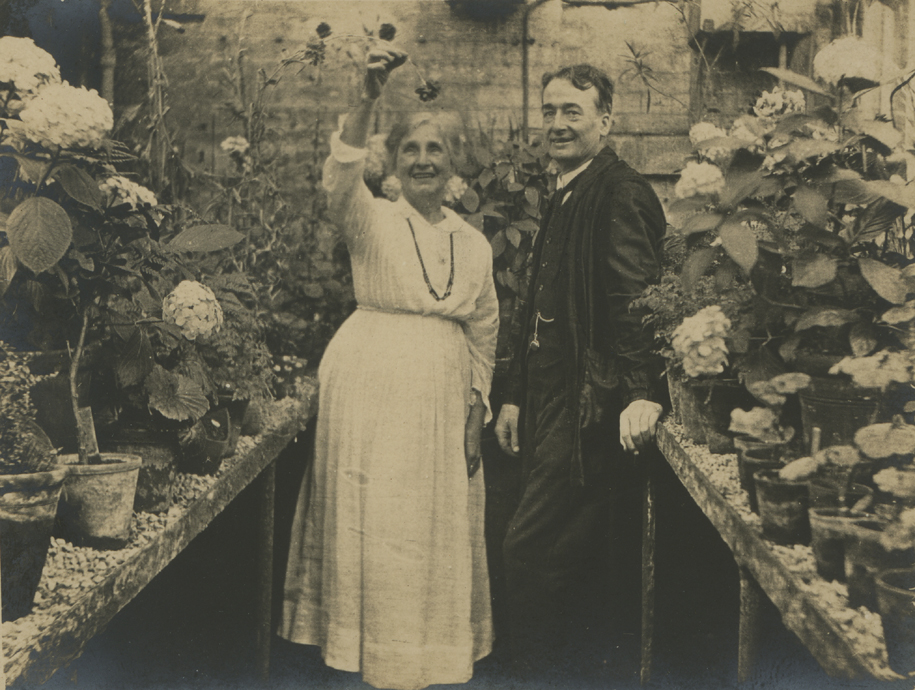 A photographic postcard of a woman and man in a greenhouse flanked by benches of potted plants holding hydrangeas and geraniums. Postally unused and undated, but perhaps c.1915.