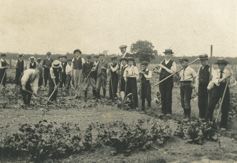 A photographic postcard of schoolboys with tools in vegetable garden and annotated, ‘Do you know any of this group of workers?’. Addressed to a Miss Chandler from ‘C’, postmarked Pangbourne in Berkshire and dated 1906.