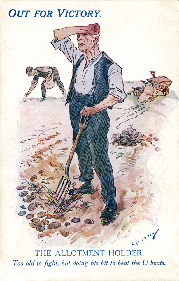 A postcard c.1915 relating to World War I food production with an illustration by Craven Hill featuring a man digging potatoes and titled ‘Out for Victory, the Allotment Holder. Too old to fight, but doing his bit to beat the U-Boats’. Given in memory of Sue Masters.