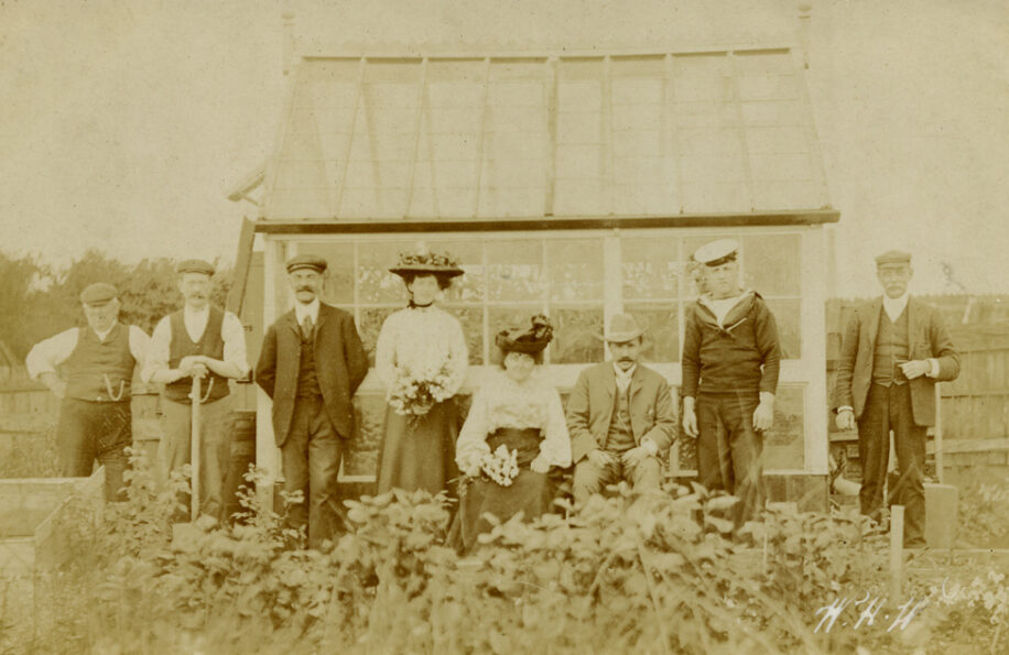 A postcard showing a group of people adjacent to a greenhouse on an allotment – one man is in a sailor’s uniform and the women are holding bouquets of picked flowers. Undated, but probably c.1910 and with the photographer’s initial, ‘WHW’.