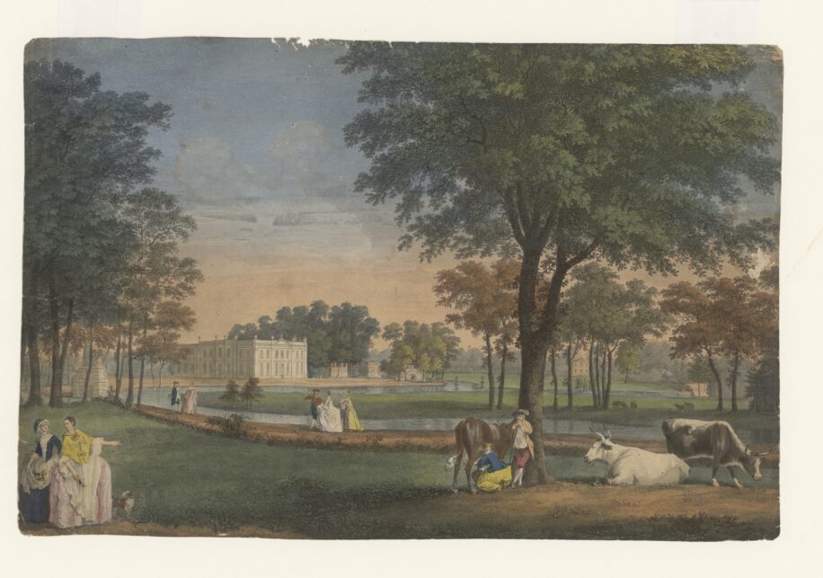 Wooburn is considered the first ‘ferme ornée’, or ornamental farm. The farm, which appeared only during the 1700s and 1800s, embraced Romantic ideals of forming a harmonious relationship between man and nature. Ferme ornée was coined as a phrase by garden designer Stephen Switzer in his 1718 book Iconographia Rustica: or the Nobleman, Gentleman and Gardener’s Recreation. He discusses combining a working farm with landscaping, stating that ‘…Profit and Pleasure may be agreeably mix’d together’. The ladies in this scene seem to be enjoying watching the cow being milked nearby.