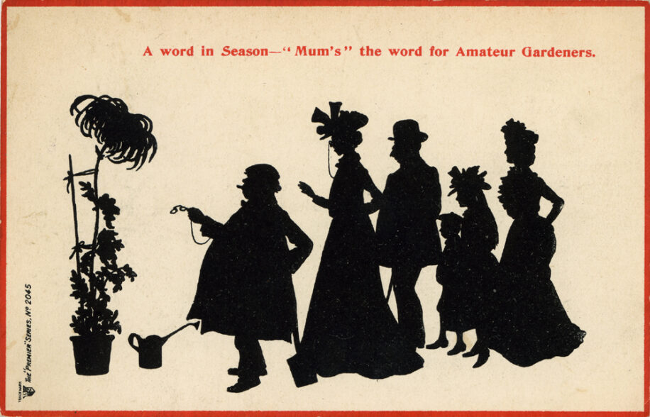 A comic postcard, ‘A Word in Season – “Mum’s” the word for Amateur Gardeners,’ showing adults, children and a dog in silhouette queuing to view a large potted chrysanthemum with watering can adjacent. Published by Premier Ltd. c.1905.