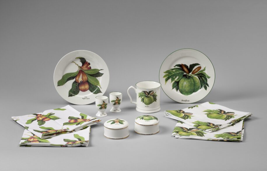 Mein was born in Jamaica but now lives in the UK. She is a lover of the English garden and this whimsical, nostalgic style can also be felt in her art. Jenny has been designing these pieces since 1998. The idea to create these decorative ceramic pieces came whilst Mein was working as a food editor. She was featuring a special summer tropical spread, and had wanted to style the food using botanical plates decorated with tropical fruit and flowers for the photographic shoot. Following an unsuccessful search, she was unable to find a single botanical plate that featured tropical fruit or flowers. She “immediately decided that [she] would produce botanical china using [her] hand-paintings of the fruit and flowers which grew in [her] beautiful childhood family garden on an old sugar estate in Jamaica to decorate the china”.