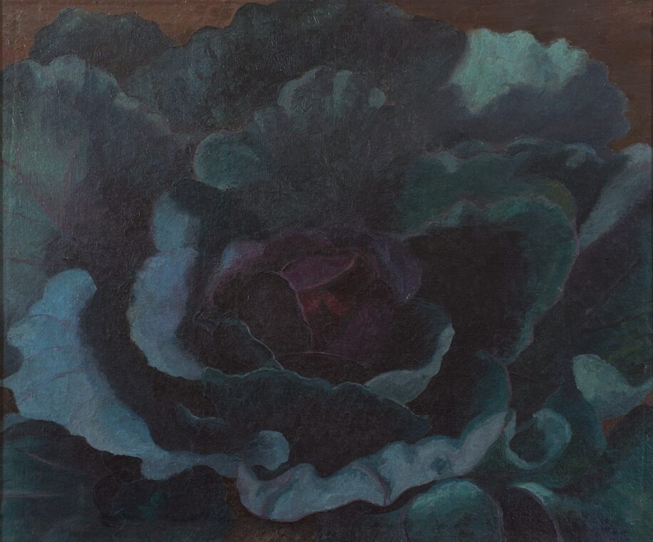 This study of a cabbage, by the artist Sir Cedric Morris (1889-1982), was donated to the Museum through the Cultural Gifts Scheme – a government initiative which incentivises collectors to give works to chosen Museums during their lifetimes. The expert panel assessing the painting consulted artist Maggi Hambling, one of the best-known pupils of Sir Cedric Morris, and Morris’ partner Arthur Lett Haines at the East Anglian School of Painting and Drawing which they set up in the 1930s. This picture was painted in 1956 at Benton End, where Morris and Haines lived and gardened from 1940 until the former’s death in 1984. The painting was unknown to Morris experts, and was shown to Maggi at Morley College, where she teaches. She immediately confirmed the painting as his work and later wrote a more personal response: When I look at this painting, I enter the unknown territory of an extraordinary cabbage. There is no escape, but I don’t want to escape, quite the reverse. I begin an almost treacherous journey – valley deep, mountain high – through the cabbage’s endless topography which not only fills the space of the canvas but extends beyond it. As I walk, I feel like an insect in a huge jungle, the texture of leaves beneath my feet. Cedric has created a sturdy cabbage which nevertheless is unfolding before our eyes. Our eyes climb over and under surrounding terrain on sensual paths enticed into the almost central secret crimson depths. Fruit and vegetables have long stood as metaphors for sexuality in art but Cedric’s totally original, up-front statement is unique. The physicality of the paint and the power of its mysterious range of colour, let alone the imposing scale of this brassica, make it possible. This is no ordinary cabbage, dead and trimmed for the pot, it is alive and growing. It seduces us. Accepted under the Cultural Gifts Scheme by HM Government from Peter Nahum and allocated to the Garden Museum, 2015.