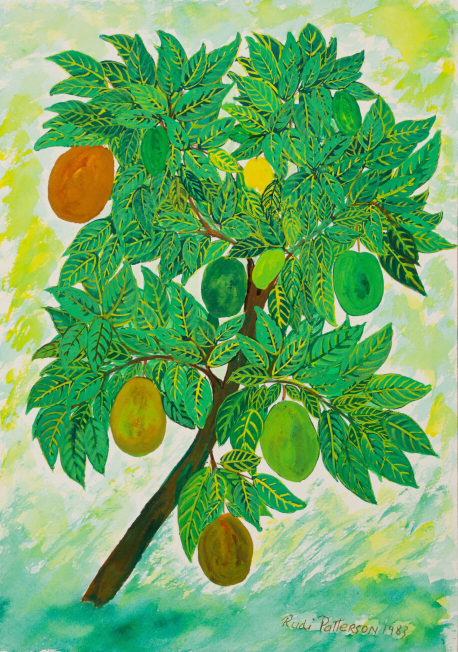 Rudi Patterson’s paintings often depict the tropical plants and landscapes of his formative years in Jamaica before he moved to the UK in the 1950s. Here he paints a Calabash Tree, commonly found across Jamaica and the West Indies. The tree produces large spherical fruits with a thin, firm shell. A successful model and actor, Patterson developed his bold style of painting while recovering from a water-skiing accident and his work often engaged with the themes of landscape, nature and memory.