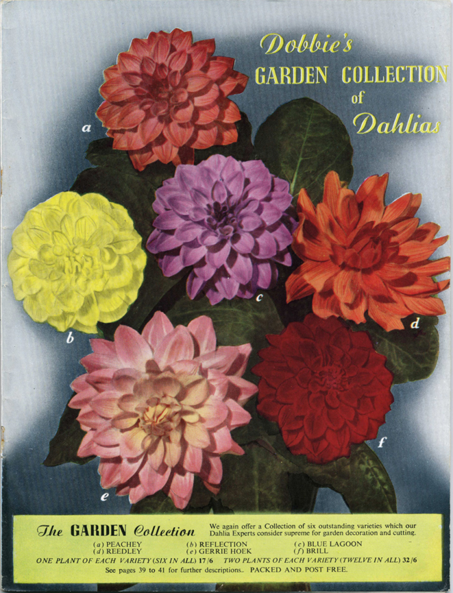 Detail of dahlias from a catalogue of seeds and plants from Dobbie & Co., Ltd., Edinburgh for 1954. From a selection of nurserymen’s catalogues collected in 1953 by Joan & Eric Basden to commemorate the coronation of Queen Elizabeth II.