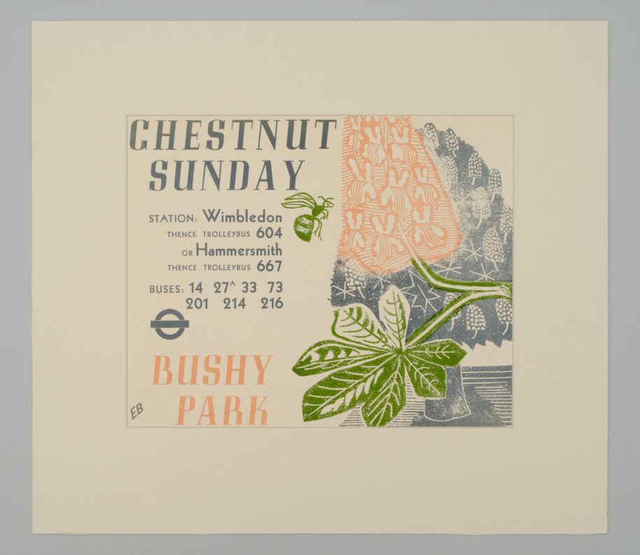 This poster advertises Chestnut Sunday in Bushy Park in southwest London. Since Victorian times the annual event celebrates, on the Sunday closest to the 11th May, the blossom of the horse chestnut trees planted over 300 years ago in the Avenue. There is a parade down the Avenue and many other activities. The poster dates from 1936 but the event continues today. This original lithograph is by Edward Bawden (1903-1989), an English painter, illustrator and graphic artist, a contemporary of Eric Ravilious. The design incorporates a chestnut tree, blossom, leaf and a bee on one side and practical access information for the visitor on the other. It was published by London Transport, one of many designs which Edward Bawden produced for them.