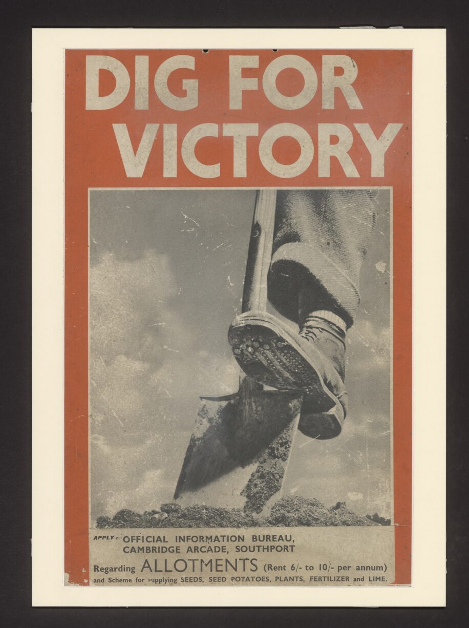 This is one of the best-known propaganda images of the Second World War. It was first issued by the Ministry of Agriculture in 1941 and various formats were printed. This particular example has had a tough life. Based on its general condition and the holes along the top, it could well have been tied to a post with string. Purchased in 2009 under the Heritage Lottery Fund’s Collecting Cultures scheme.