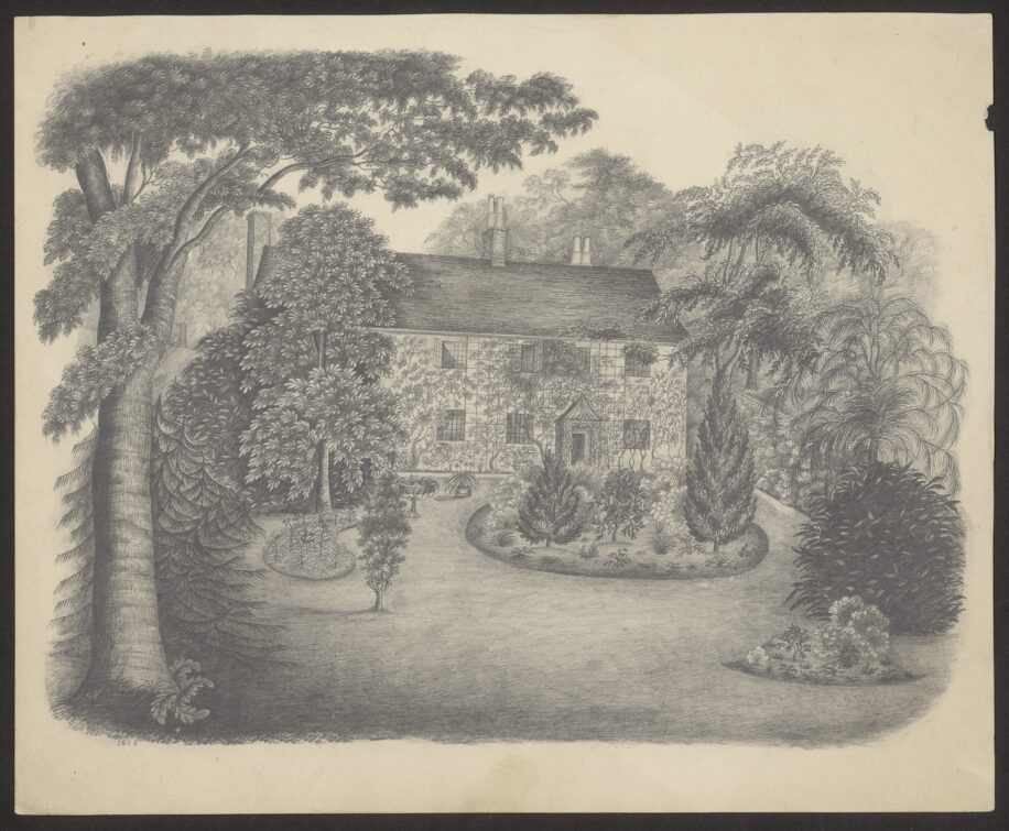 A charming pencil drawing on card of a small house and garden; the walls and porch of the house are covered with trellis which supports climbing plants. In front of the house there are three curved flower beds filled with plants and shrubs and the house is surrounded by a variety of trees. On the lawn there are a couple of plant containers. The drawing is dated in the left corner ‘1836’ but it is unsigned. Purchased in 2010 under the Heritage Lottery Fund’s Collecting Cultures scheme.