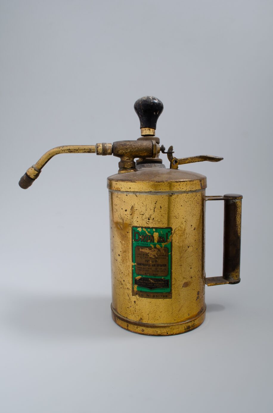 Pumps and sprayers allow for pesticides to be distributed widely. This is a cylindrical brass can pump sprayer with a side handle and pressurised pumping mechanism on the top. The green label on the cylinder body indicates it is a ‘DRON-WAL’ sprayer, this is the registered trade mark of the makers, The Philip B. Waldron Co. of Kings Road Tyseley, Birmingham.
