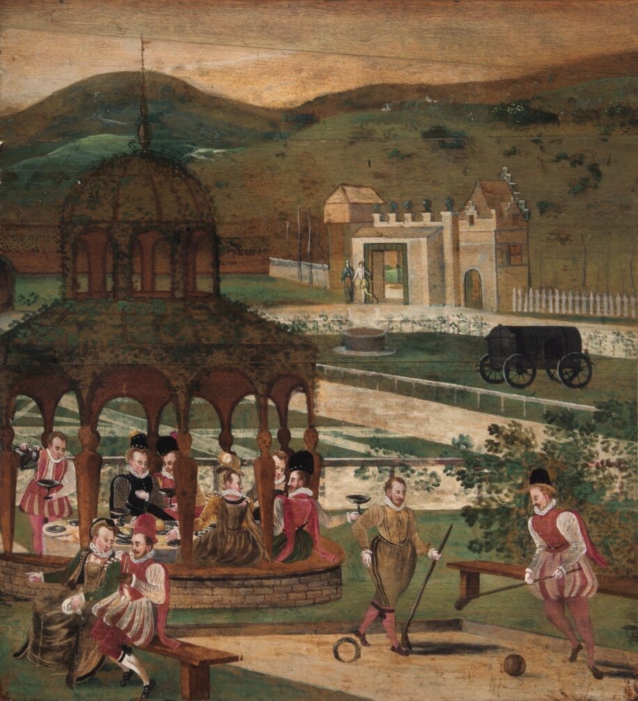 The oldest painting in the Museum’s collection dates from between 1600 and 1610 and depicts a group of figures playing Troco, a form of lawn bowls, which involved hitting a wooden ball through an iron ring. The painting was acquired as a visual record of the style of gardens at the time when John Tradescant began his career; it is not known whether it was a topographical view – very rare at this time – or a visualisation of an ideal garden. In the background we see formal gardens of parterres and gravel paths. The gated entrance was another feature of the new properties being built around this period, and the ivy-covered pergola provided a perfect space for a group to enjoy lunch al fresco. Arbours could be found in some of the most renowned gardens of the time, at Nonsuch, at Kenilworth Castle and at Wilton House. Thomas Hill, who wrote one of the earliest treatises on gardens in 1577, tells us that they might be covered with cucumbers, melons and grapevines; others favoured jasmine, roses and honeysuckle. The pergola scene in this painting is based on a contemporary print, suggesting the artist was assembling a picture of what the loveliest garden might look like from existing sources. Examination during conservation work revealed that this painting was once part of a decorative panel for a room, indicating that this may have very well been the case.