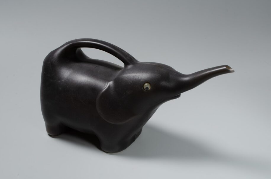 Grey plastic watering can in the shape of an elephant with googly eyes and a trunk shaped spout. Traditionally watering cans were made of clay and then metals such as steel or copper. The invention of plastic in the 20th century has lead to a great variety of designs which are lighter than their metal counterparts. This malleable material also allows for fun and creative designs such as this can which was made in Holland.