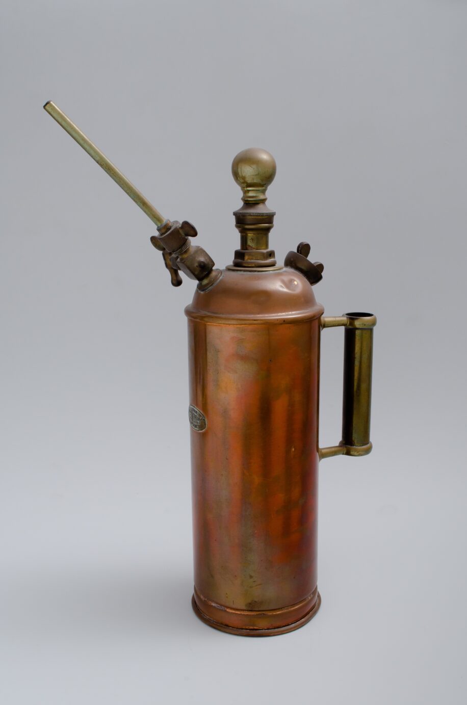 Pumps and sprayers allow for pesticides to be distributed widely. This is cylindrical pump sprayer used for spreading fungicide or insecticide, it is made from copper with a brass trim. There is a brass knob which was used to pump the liquid through the spout which is unfortunately broken and therefore shorter than it would have been when it was in use. The small brass plate has the ‘ENOTS’ trademark of Benton & Stone (Enots is Stone spelled backwards) who were based in Aston, near Birmingham. The company was founded in 1814 and the sprayer dates from 1850 to 1900.