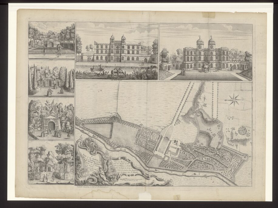 A Plan of the Garden & View of the Buildings of the Rt Honble Henry Pelham Esq. at Echa [in the County of Surry Survey’d & Engraved by J. Roque. This garden at Esher Place was designed by the landscape architect, William Kent, from 1733 onwards for Henry Pelham, who later became Prime Minister. The garden included sweeping lawns, ornamental buildings and water features. Kent was one of the early leading figures of the English Landscape Garden movement, which sought to return the ‘natural’ to the garden, and escape more formal styles. The movement revolutionised the country estate garden. John Rocque was a surveyor, cartographer, and engraver, who is well known for his early map of London, published in 1747. This engraving may have been produced to illustrate one of the early books on garden design. Purchased in 2009 under the Heritage Lottery Fund’s Collecting Cultures scheme.