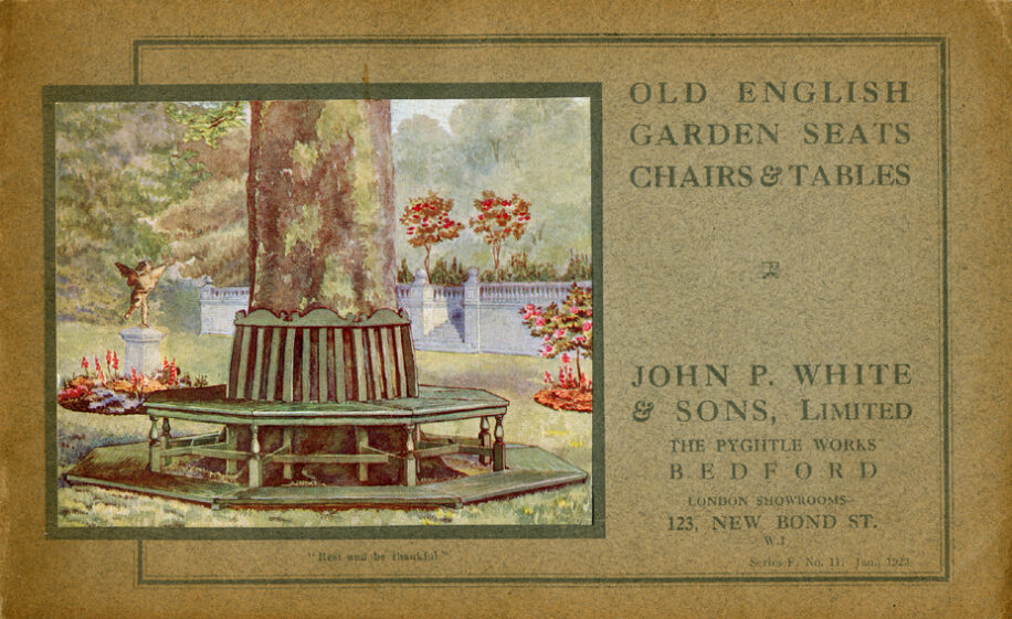 A catalogue of Old English Garden Seats, Chairs & Tables – garden furniture made from John P. White & Sons of 123 New Bond Street, London, and The Pyghtle Works in Bedford.