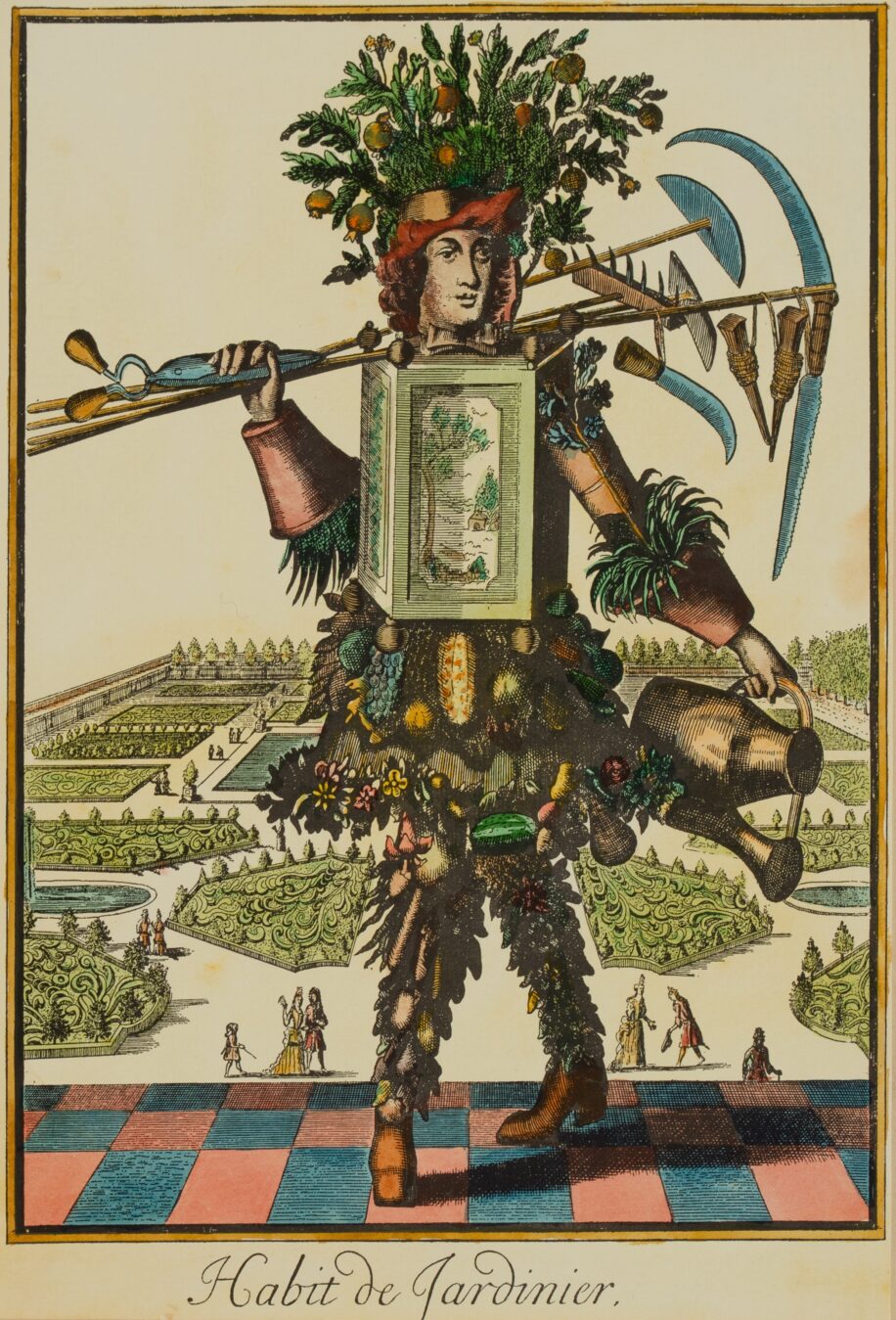 Coloured print titled ‘Habite de Jardinier’ based upon a similar print from the series ‘Les Costumes Grotesques et les Metiers’ by Nicolas de Larmessin II, a 17th century French engraver. The gardener is depicted in a playful costume made up of objects associated with his trade. He carries a plethora of tools over his right shoulder and holds a watering can in his left hand. His forearms are encircled with potted plants, he wears a decorated planter around his chest and a fruit tree emerges from his hat. Many other plants adorn the costume; the setting is a formal garden which appears in the background. The date of this version of the print is unknown.