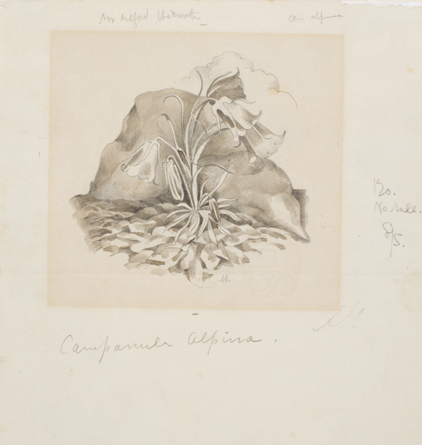 The artist John Nash (1893–1977) is best known for his harrowing First World War landscapes but in the later part of his life united his two loves of gardening and art. Early in his career, Nash worked as a journalist before being encouraged by his brother, the artist Paul Nash (1889–1946), to pursue watercolour and landscape painting, despite the fact he had never received any formal artistic training. Nash was introduced to horticulture in the 1920s by Clarence Elliott of the Six Hills Nursery in Stevenage. He drew what Elliott had collected on his plant hunting trips in England and around the world; in return for this horticultural education he illustrated a number of the nursery’s catalogues. Nash’s neighbour in Suffolk was fellow artist-gardener, Cedric Morris; they were two of the founders of the Colchester Art Society in 1946. In his book Outsiders (2008) Ronald Blythe – who inherited Nash’s house and garden – remembers that the two saw themselves as ‘fellow gardeners’ who ‘would talk plants all the time’. Nash taught botanical art classes by placing a flower in a jam-jar, remembers Blythe, and while on a winter visit to Staverton Thicks, Nash simply ‘stuck his portable stool in the dense mulch, opened his sketchbook and began to draw’. This apparently was a very normal way for him to work. This pencil and wash sketch of a Harebell (Campanula Rotundifolia) was made in the last year of Nash’s life and was donated to the Museum by Sue and Colin Cohen in memory of Commander Kenneth Cohen CB CMG and Mrs Mary S Cohen.