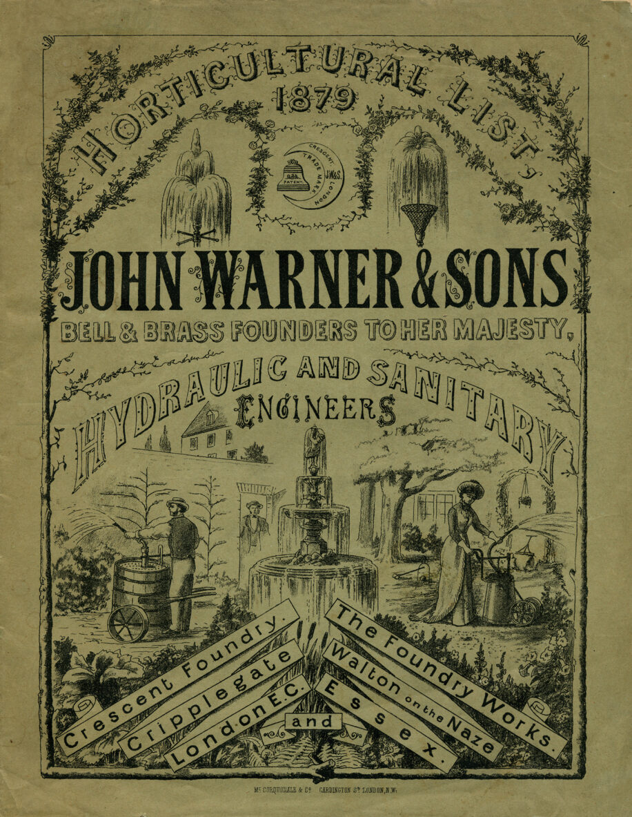 A horticultural list of hydraulic garden equipment from John Warner & Sons of the Crescent Foundry, Cripplegate in London. Warner & Sons were bell and brass founders to Her Majesty Queen Victoria, and also owned the Foundry Works at Walton on the Naze, Essex.