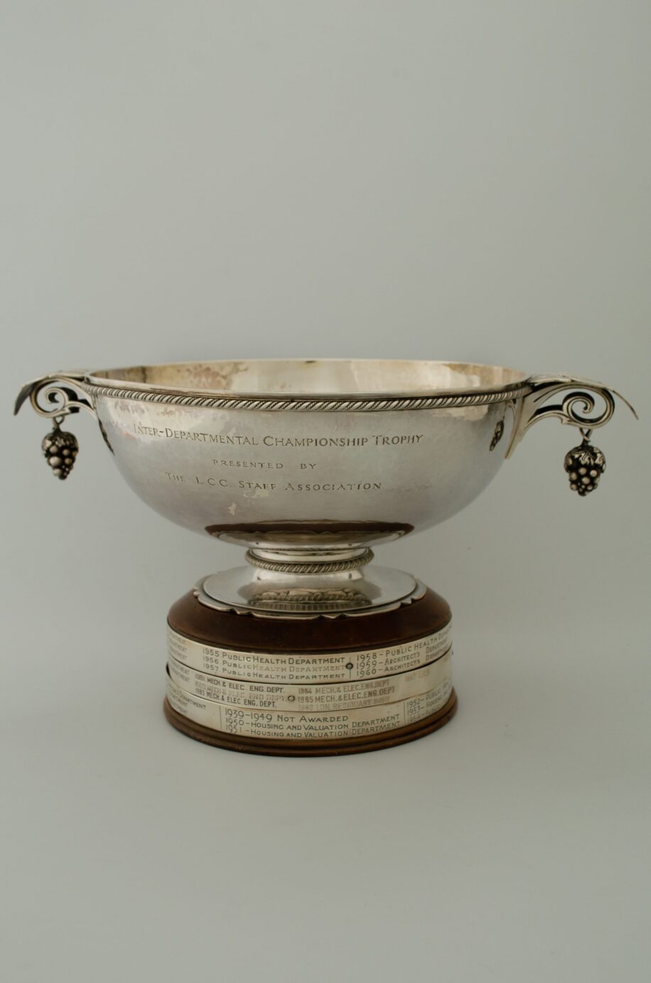 A silver bowl trophy with two leaf handles from which are suspended a small bunch of grapes. The trophy was presented by the LCC (Staff) Association for their staff Horticultural Society, and there’s a reference to the GLC from 1.4.65. The wooden base has a silver collar engraved with the names and dates which the various departments won, between 1930 and 1987. The winning departments included, amongst others, Supplies, Architect’s, Public Health and Education Officer’s. The cup was donated to the Garden Museum in 1988 when the GLC was disbanded.