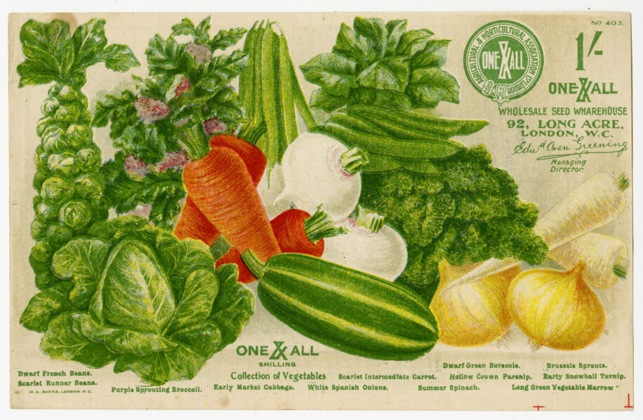 A colourful lithographic print of a selection of vegetables promotes the ‘One & All’ Wholesale Seed Warehouse at 92 Long Acre, just to the northwest of Covent Garden. The print reproduces the signature of its Managing Director, Edward Owen Greening, who was also renowned as a social reformer and supporter of the co-operative movement. He founded the Agricultural and Horticultural Association, alternatively known as the ‘One & All’ in 1868. The company’s business was adversely affected by World War I and it closed in 1915. Greening died in 1923.