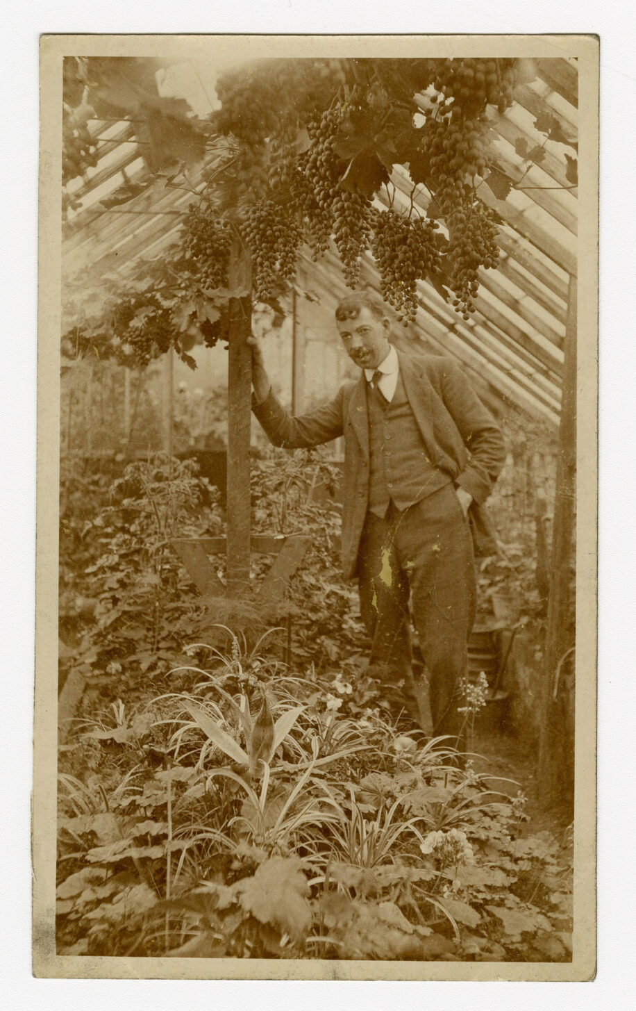 A sepia real photographic postcard of a man posing under a laden grapevine in a glasshouse with tomatoes and assorted plants adjacent. The card is addressed to ‘Mr Bray’ from ‘J.C’. Photograph taken by C.H. Collard of Cheddar in Somerset, England, c.1905.