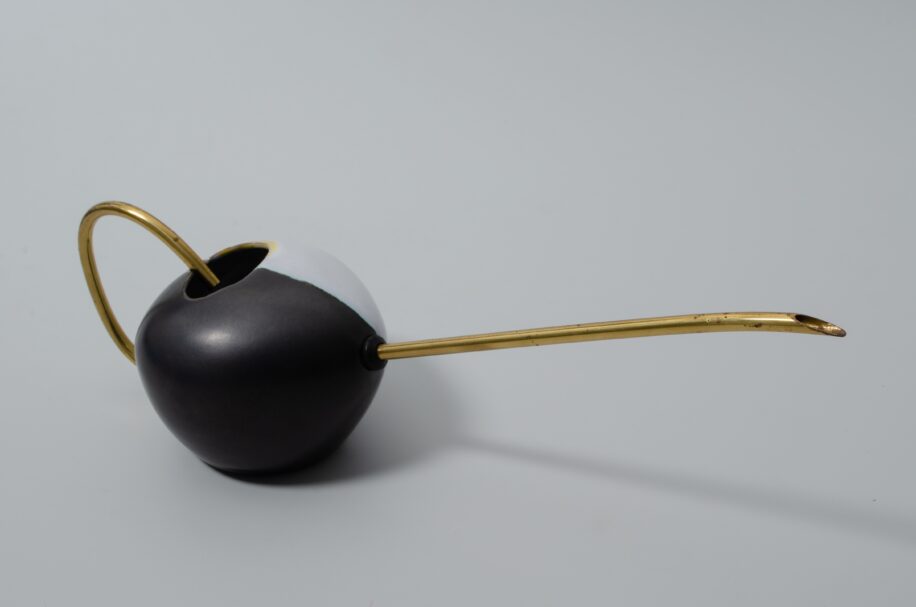 Black and white ceramic watering can with a single piece of copper pipe passing through the body to form both the spout and handle. Due to this unusual design, it does not function as a watering can because water has no way to enter the spout from the body. This suggests it is a mock watering can for decoration rather than function. It was produced in Germany around 1970.