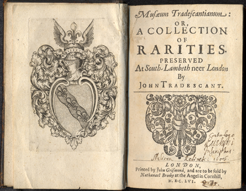 The frontispiece of Musaeum Tradescantianum : or a Collection of Rarities preserved at South-Lambeth neer London by John Tradescant , printed by John Grismond and sold by Nathanael Brooke at The Angel in Cornhill, London 1656. This extensive list of contents in The Ark museum and plants grown in their garden belonged to the diarist John Evelyn (signed ‘Catalogo Evelyni’). Benefactors to the collection included King Charles I and Queen Mary, William Laud and the Duke of Buckingham etc. Printed by John Grismond.